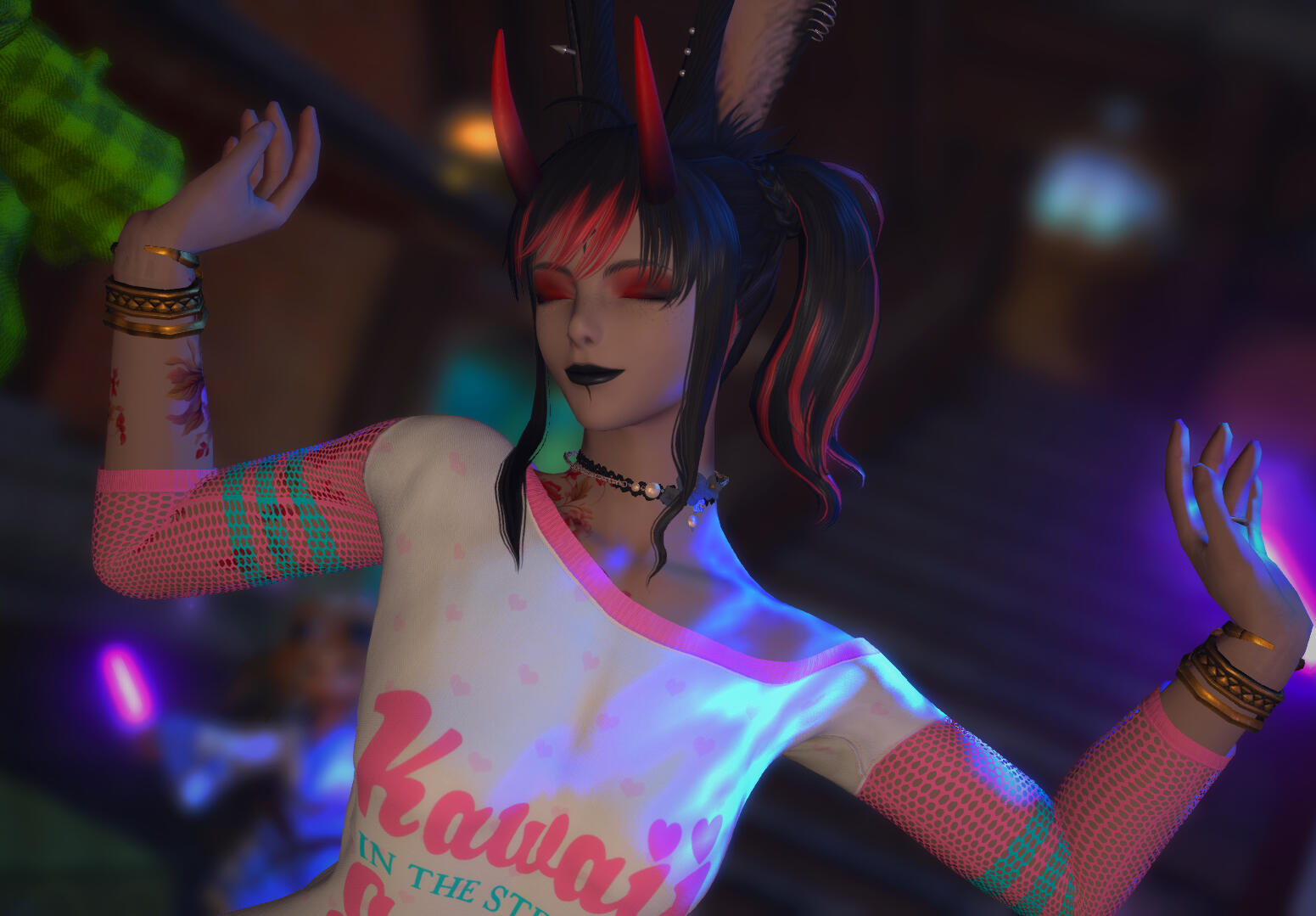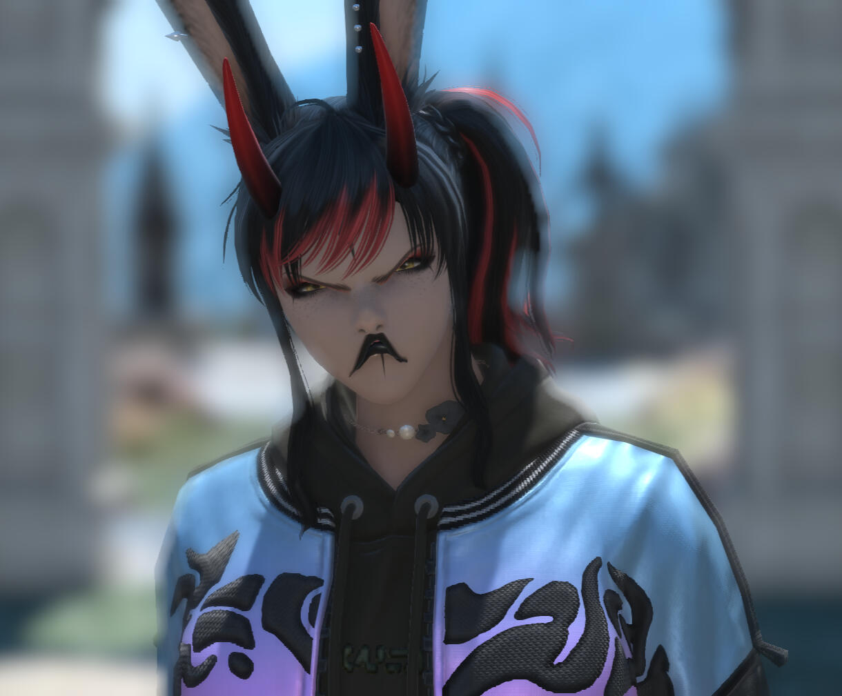 No goodbye letters, no dramatic exits — just a stowaway spot on a Gleaner ship and a one-way trip to the mainland.Her grand adventure? Started with culture shock, a feral survival arc, and a not-so-glamorous residency behind the food stalls of Limsa Lominsa. The city was loud, bright, and full of more people than she’d ever imagined — and most of them weren’t exactly handing out bunny treats. She dumpster-dived, raccooned her way through alleyways, and made enemies with more than a few angry shopkeepers.Then came the lute.It was broken, barely held a tune, and she had no idea how to play it — but she did know how to make a scene. Whether she was smashing it for rhythm or serenading passing sailors (badly), she eventually stumbled into a bar, a bard, and a revelation: you’re supposed to strum the damn thing. Cue the montage of blisters, bar gigs, and big dreams.Now known across the seedier side of Eorzea as “Dumpster Bunn,” Cinnabun’s turned chaotic charm into a stage act and a lifestyle. She takes odd jobs, plays weirdo taverns, and thrives on attention, tips, and teasing.But beneath the bratty sparkle is a fiercely loyal soul, owned and deeply bonded to the love of her life: Juniper Kawaii. Don’t let the flirtiness fool you — she may tease, but her heart is already claimed.